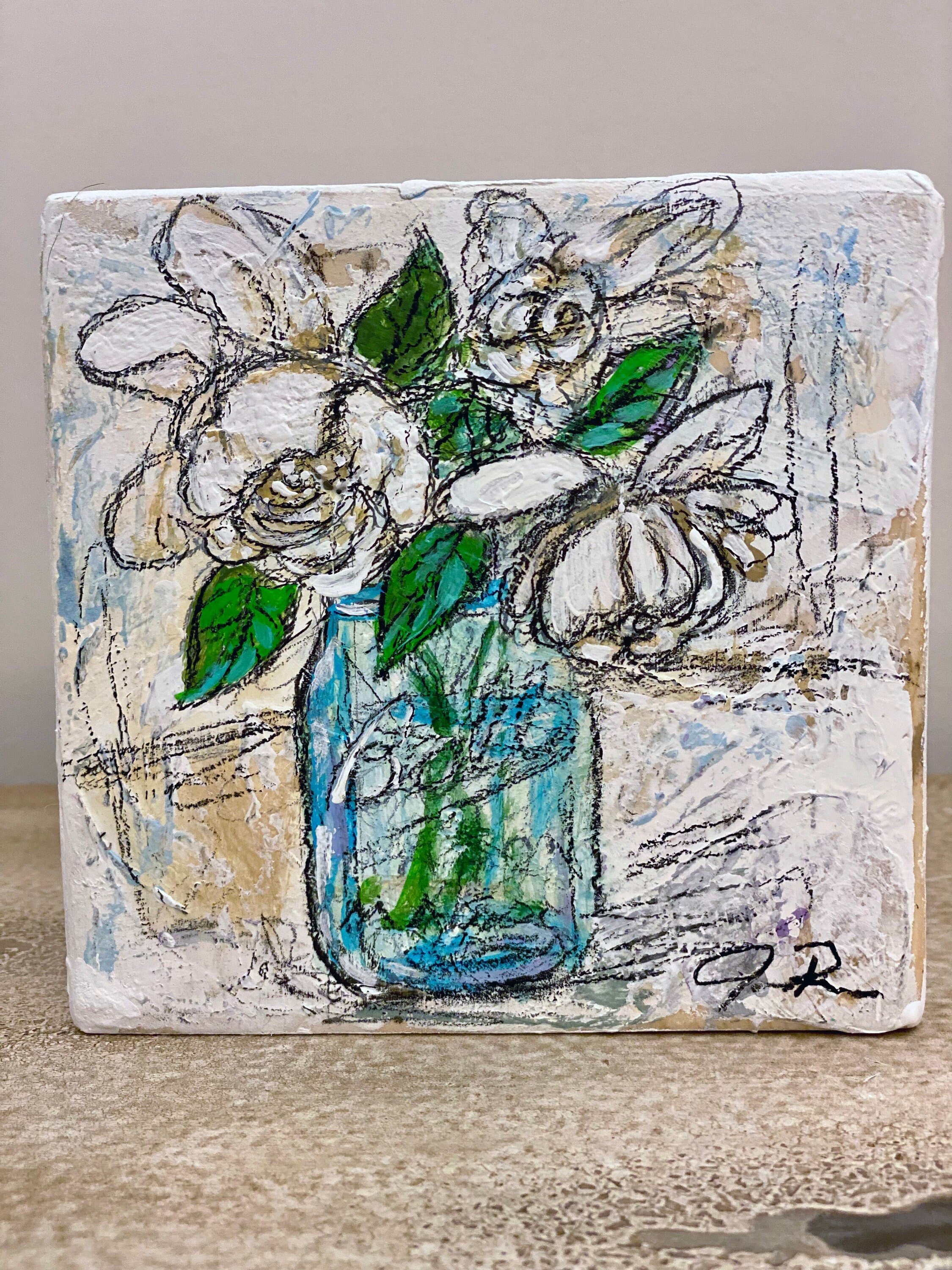 Gardenia blooms fill the air with a sweet, familiar scent closing out spring and announcing the summer season. Fresh flowers always brighten any spot. Original work, painted in acrylic and graphite pencil on weathered wood. Ready to hang on a wall or stand on a table or shelve. The 1" block makes it easy and interesting to display. Sealed with a mat finish to protect the art.