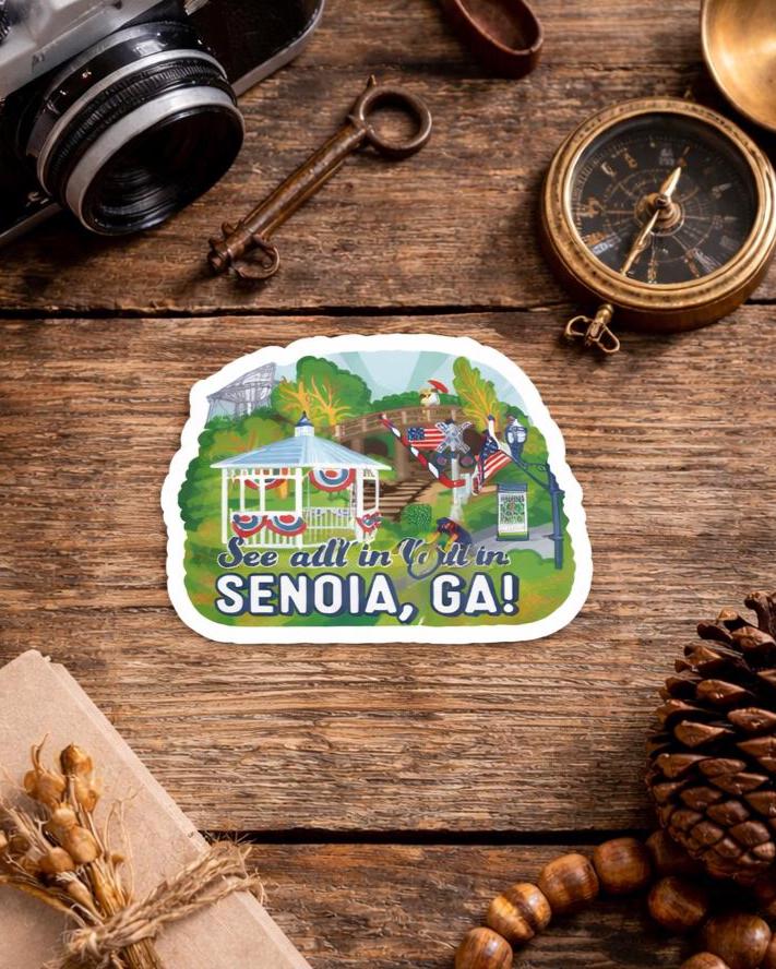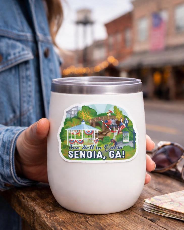 Senoia, GA sticker includes a sample of images taken from the scenic poster. A popular spot for movie locations, local events and cyclists, this town is full of charm. 3" x 3" is a perfect size for cups, computers, cars or anything you want to decorate. This are durable, thick, vinyl stickers that are protected from scratches, water & sunlight. Single sticker. Bundle packs are also available to order. FREE SHIPPING via USPS first class mail. US only.