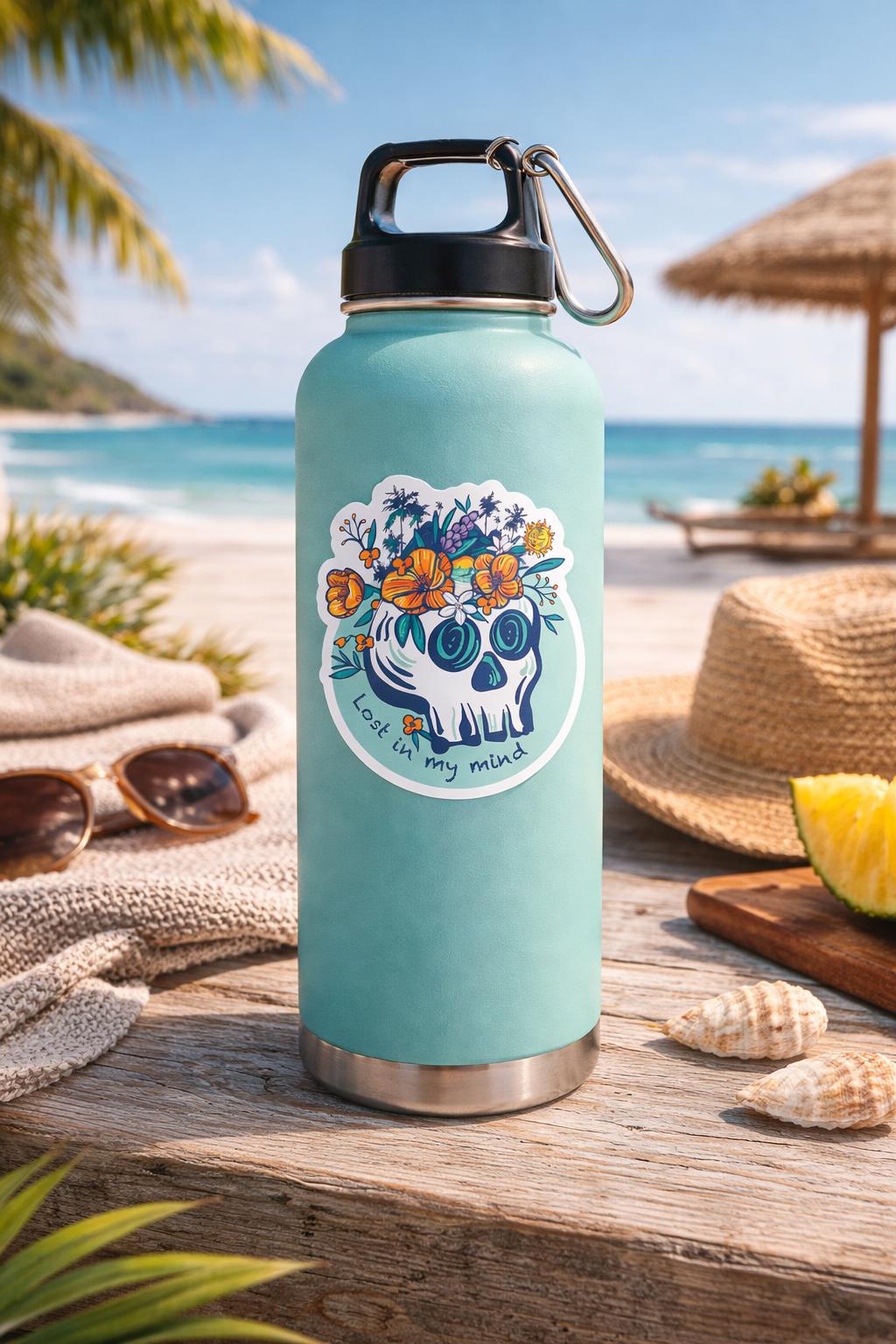 Inspired by laid-back California PCH road trips and salty ocean air, the “Lost in My Mind” vinyl sticker brings beachy, free-spirit vibes wherever you stick it. Featuring a colorful skull with tropical florals and coastal details, it’s the perfect little piece of art for everyday adventure.