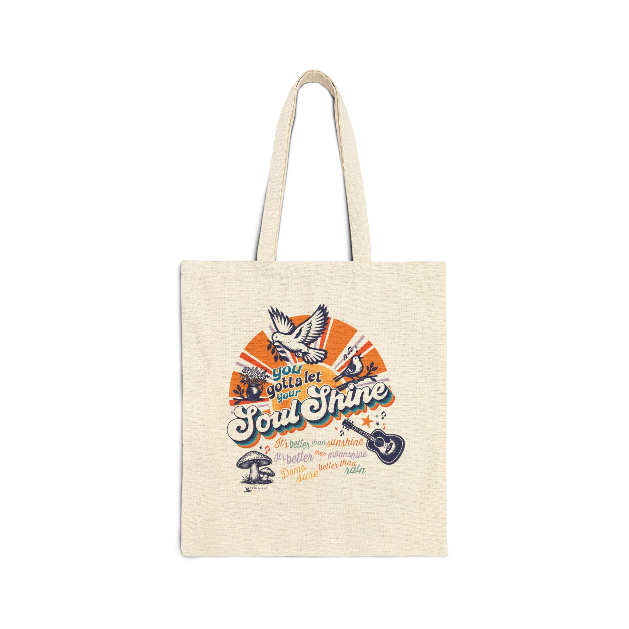 "Let Your Soul Shine" is a positive message to carry all your extras! Take it along to the beach, music festivals, class, work or shopping. It's ready to go! Artwork inspired by the best one of the best songs ever! Illustration is a vintage vibe with retro, west coast colors and woodcut style images of mushrooms, flowers, guitar, a singing bird, and a dove for peace.