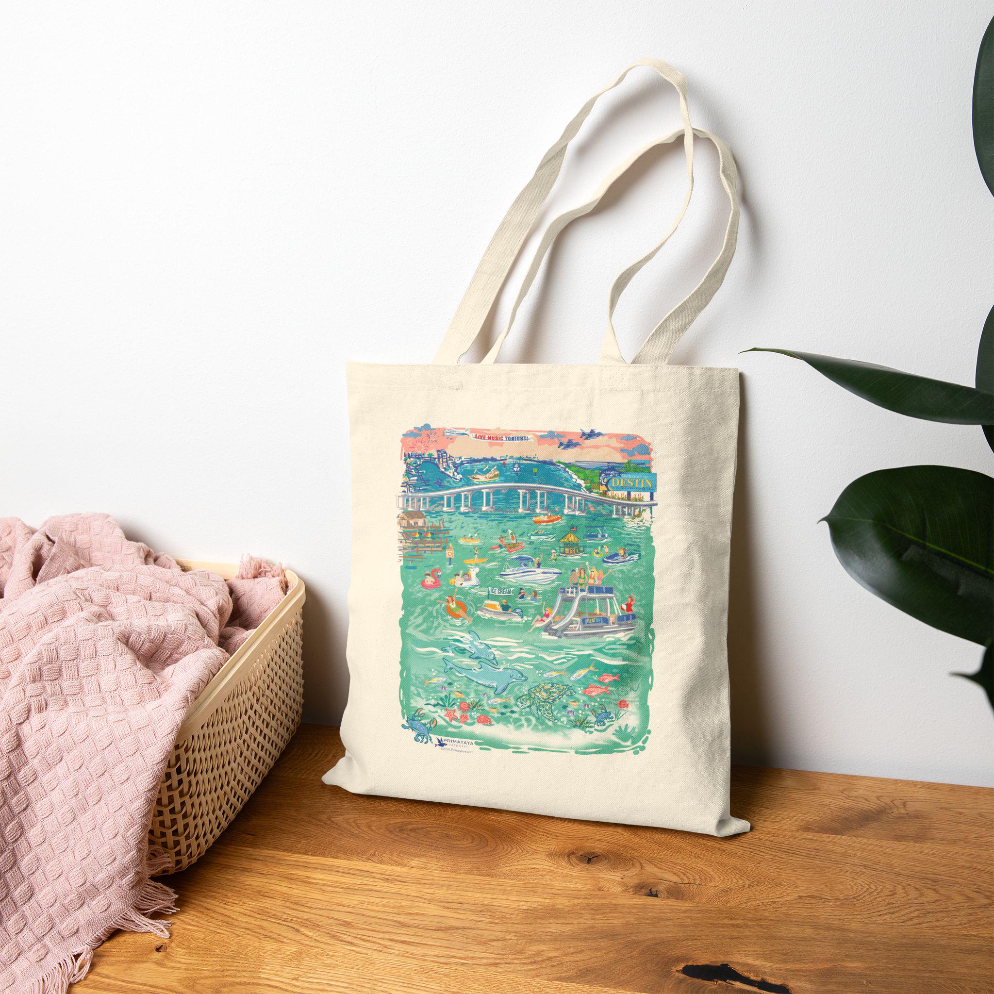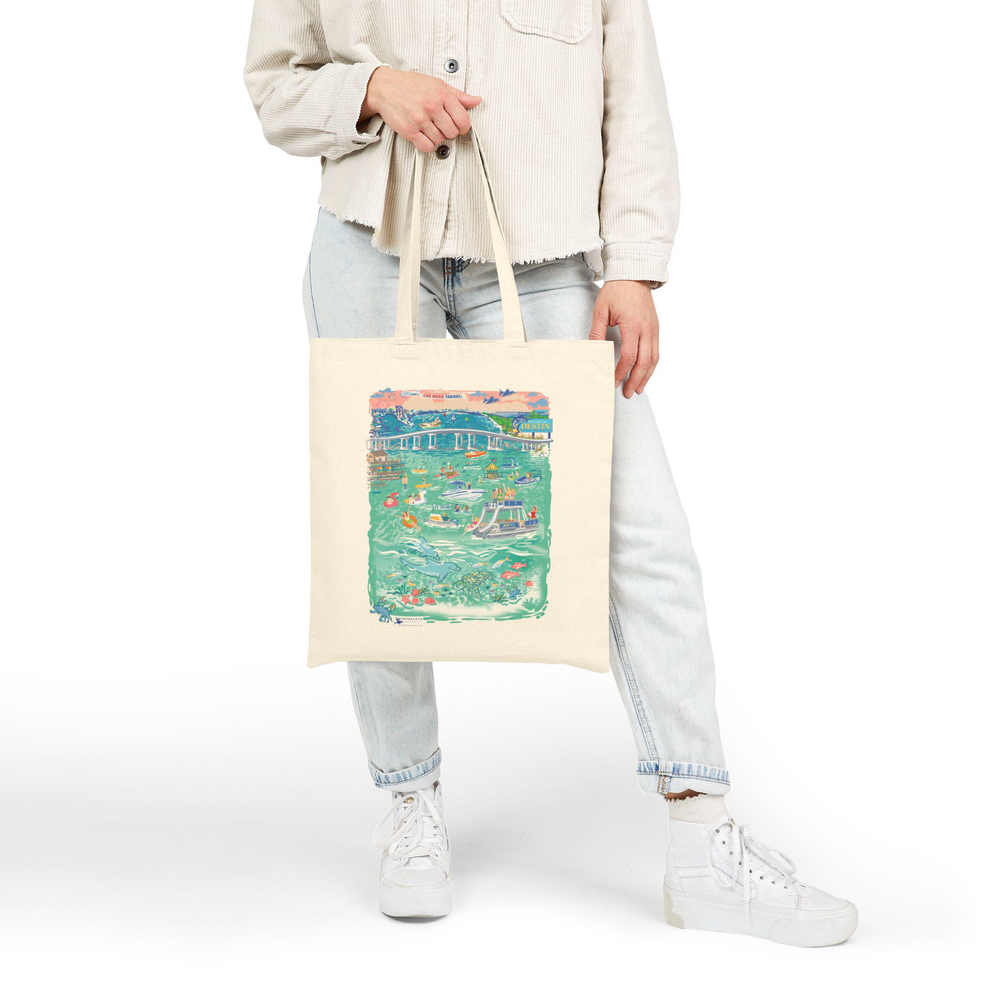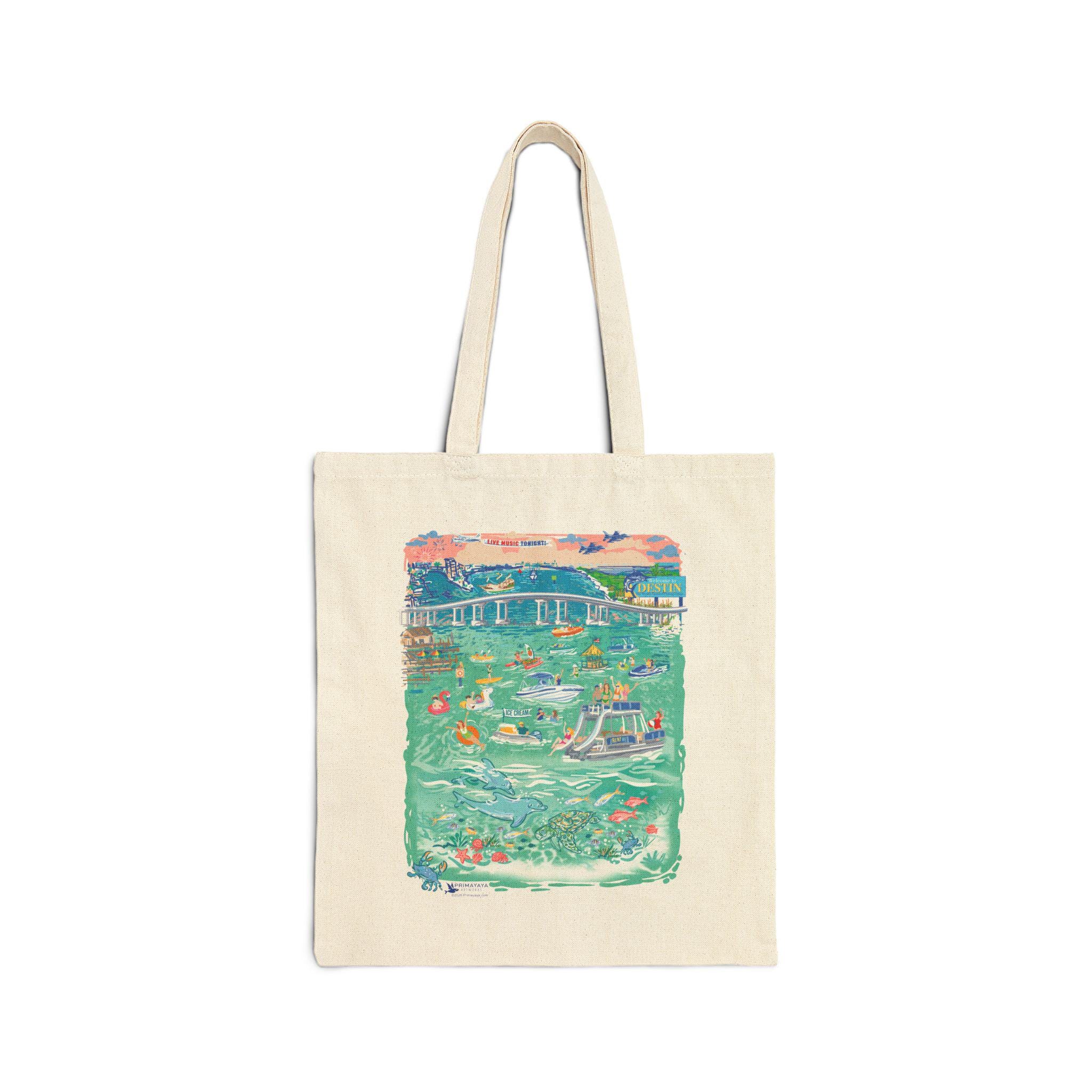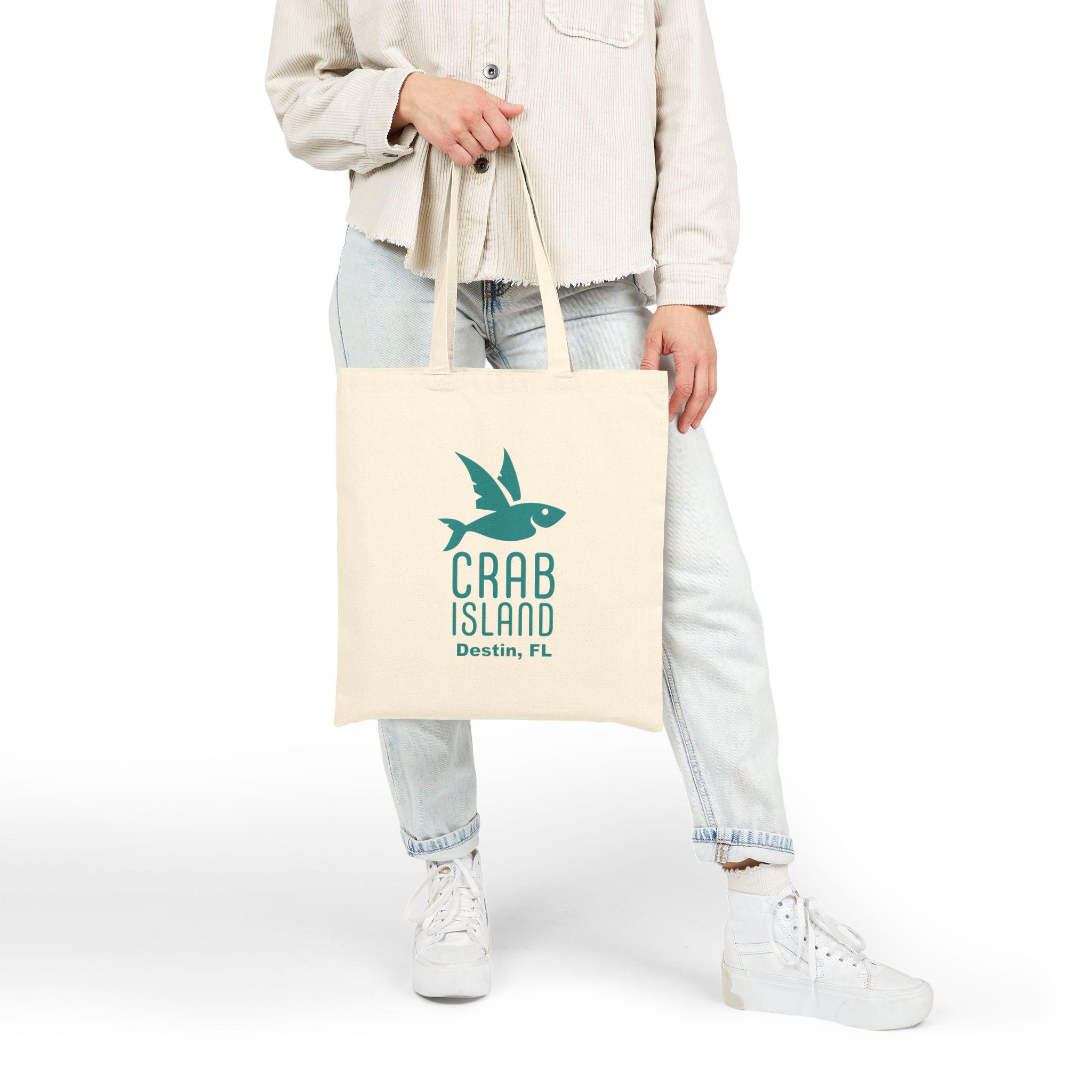 It's Party Time! The Crab Island canvas tote bag is perfect to carry all your extras! Take it along on the boat, or to go the beach, music festivals, class, work or even shopping. It's ready to go! Artwork is inspired by the well-known (by boat only accessible) favorite attraction in Destin, Florida. The clear, shallow water is a popular gathering spot for boats and water toys. It is a landmark icon with its floating party of pontoons, wave runners, kayaks, food vendors and boats of all sizes. The activity is captured in this vintage-style illustration created by the artist. A perfect vacation bag or as a gift for your beach going friends. Be sure to check out the crab island design in stickers, T-shirts and posters. Bag is printed on both sides. Crab Island logo on one side and the full color illustration one the other.