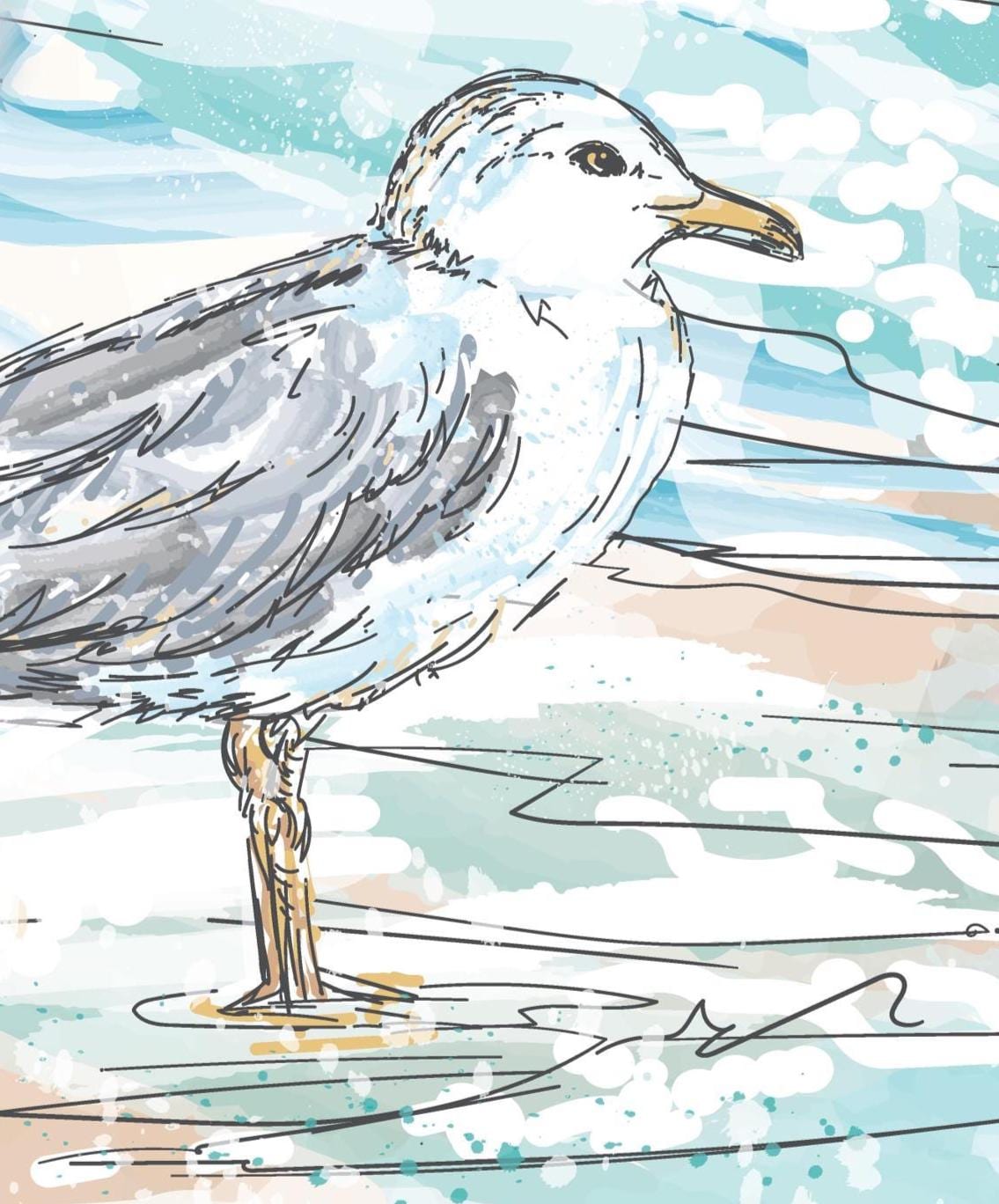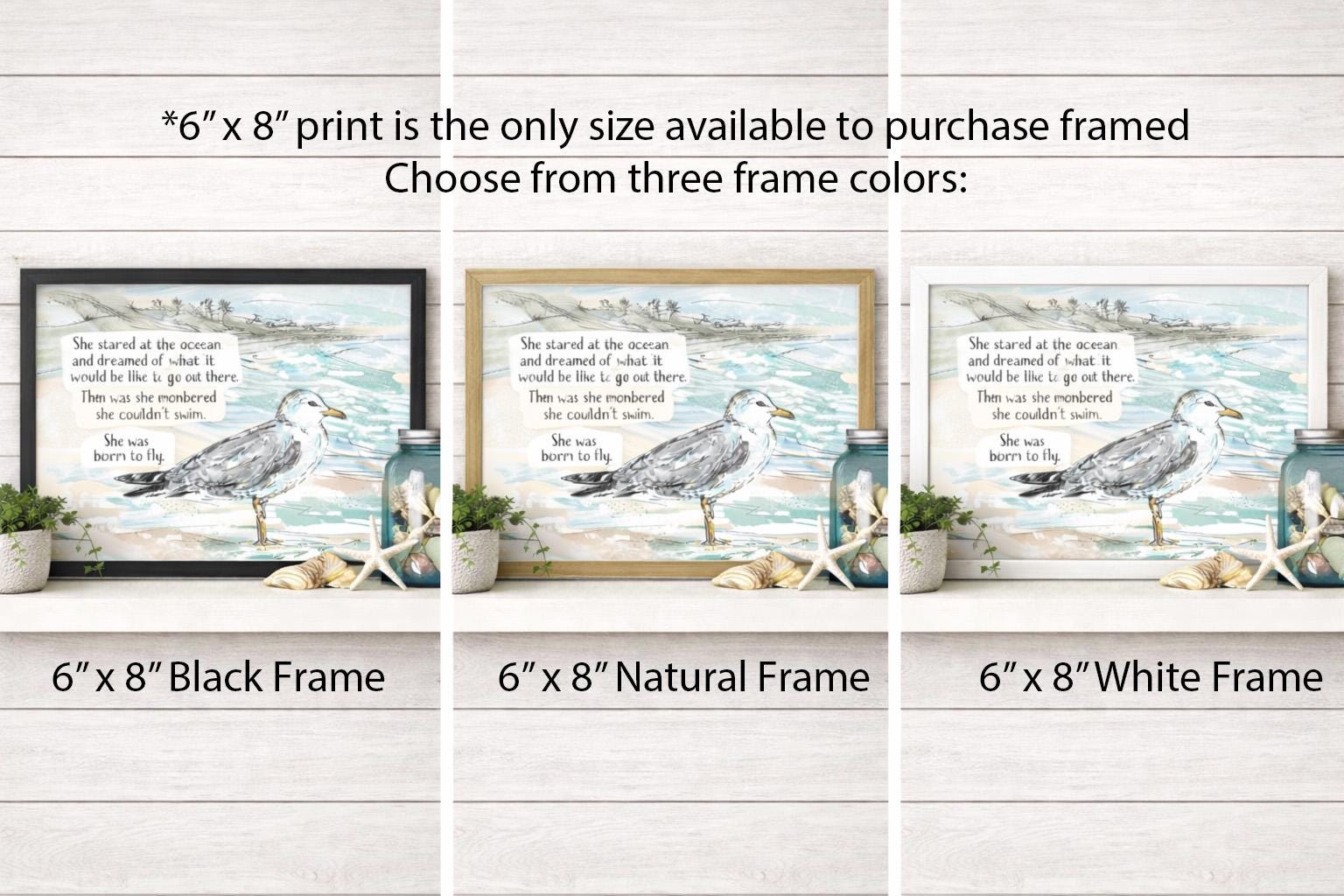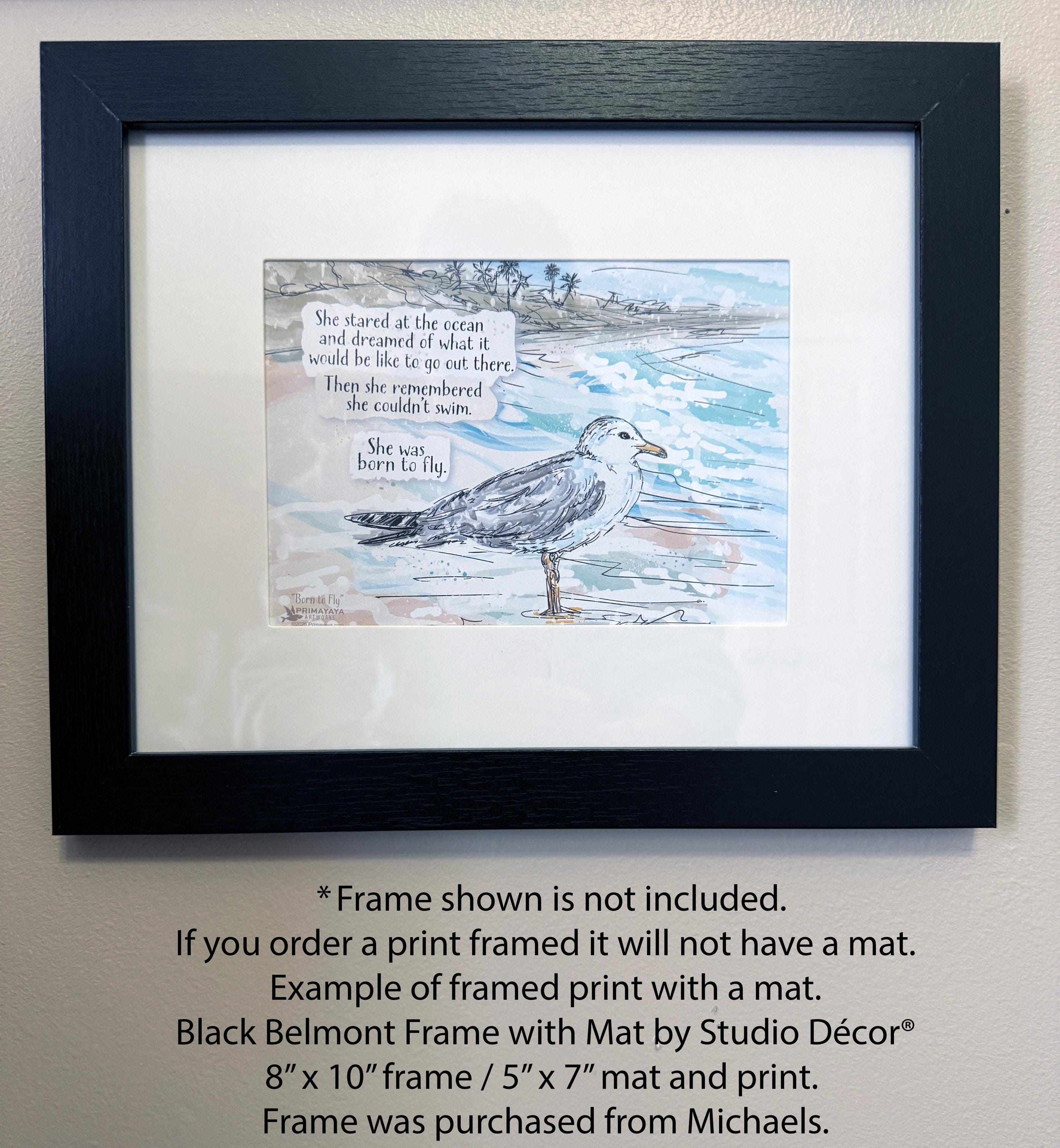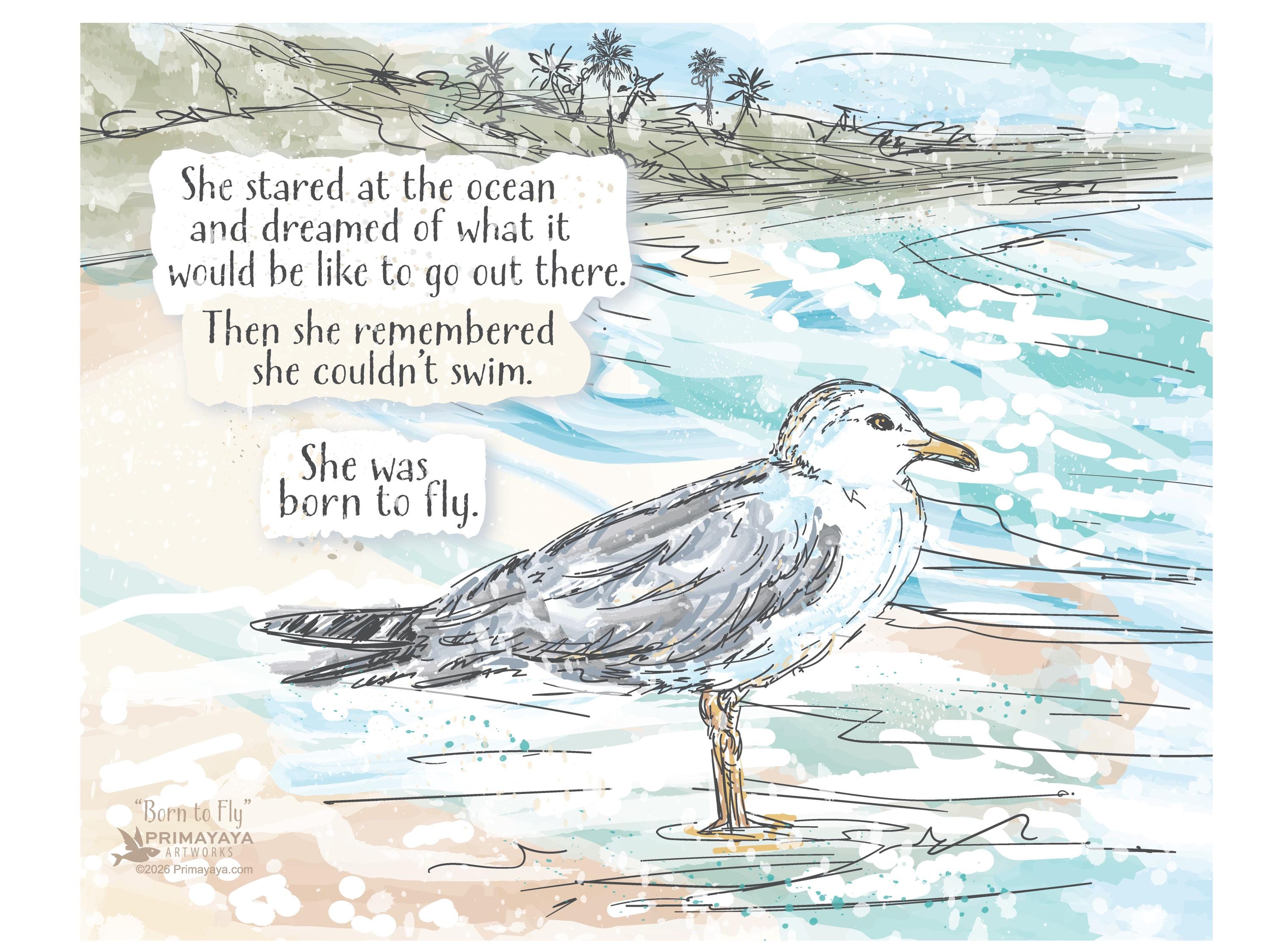 This peaceful seagull print is a gentle daily reminder to be brave, trust your path, and take the next step — even if it feels a little scary. With soft coastal blues, warm sandy tones, and a hand-drawn ink + watercolor style, this piece brings a calm, encouraging energy to any space.