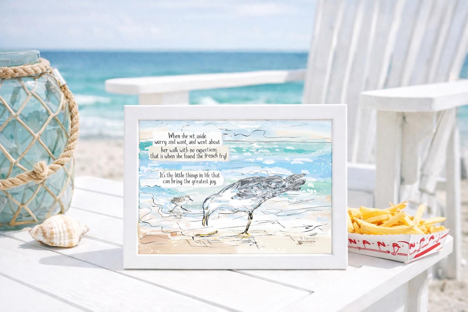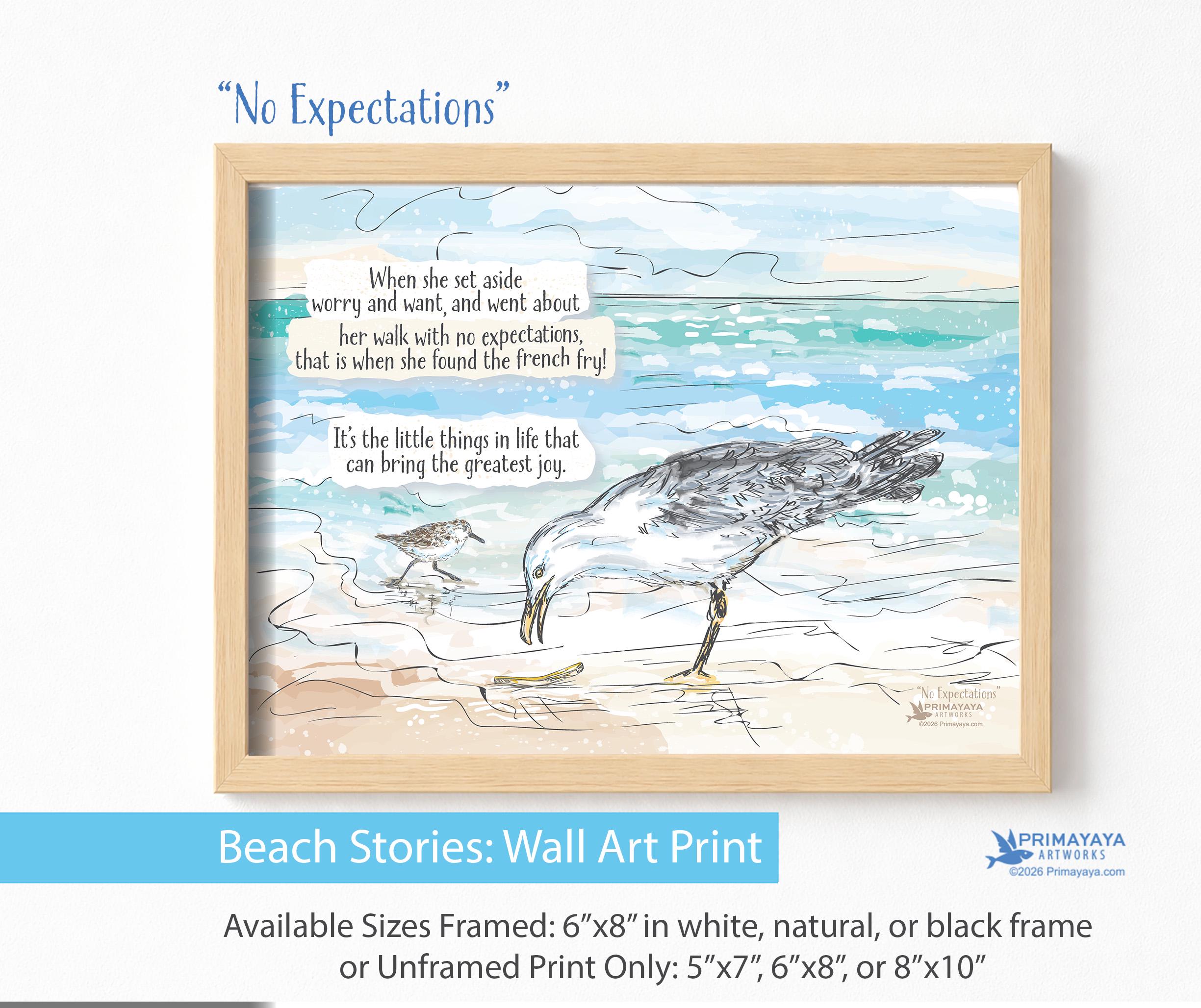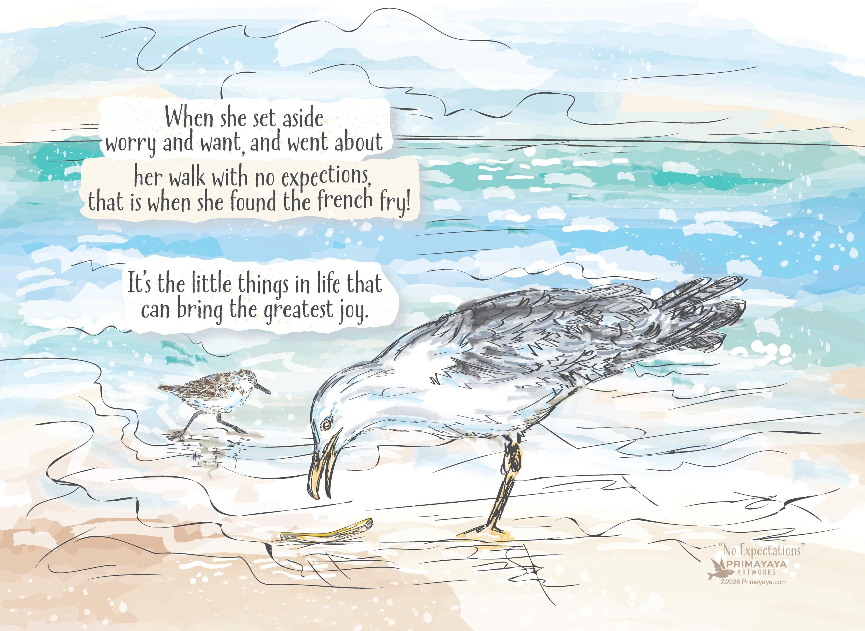 "No Expectations," is part of the Beach Stories art series. This playful coastal print is a gentle reminder that sometimes the best things show up when we let go of expectations and worries. Featuring a hand-drawn seagull discovering an unexpected treasure on the shore, this piece blends humor, faith, and mindfulness in a way that feels light, relatable, and encouraging.