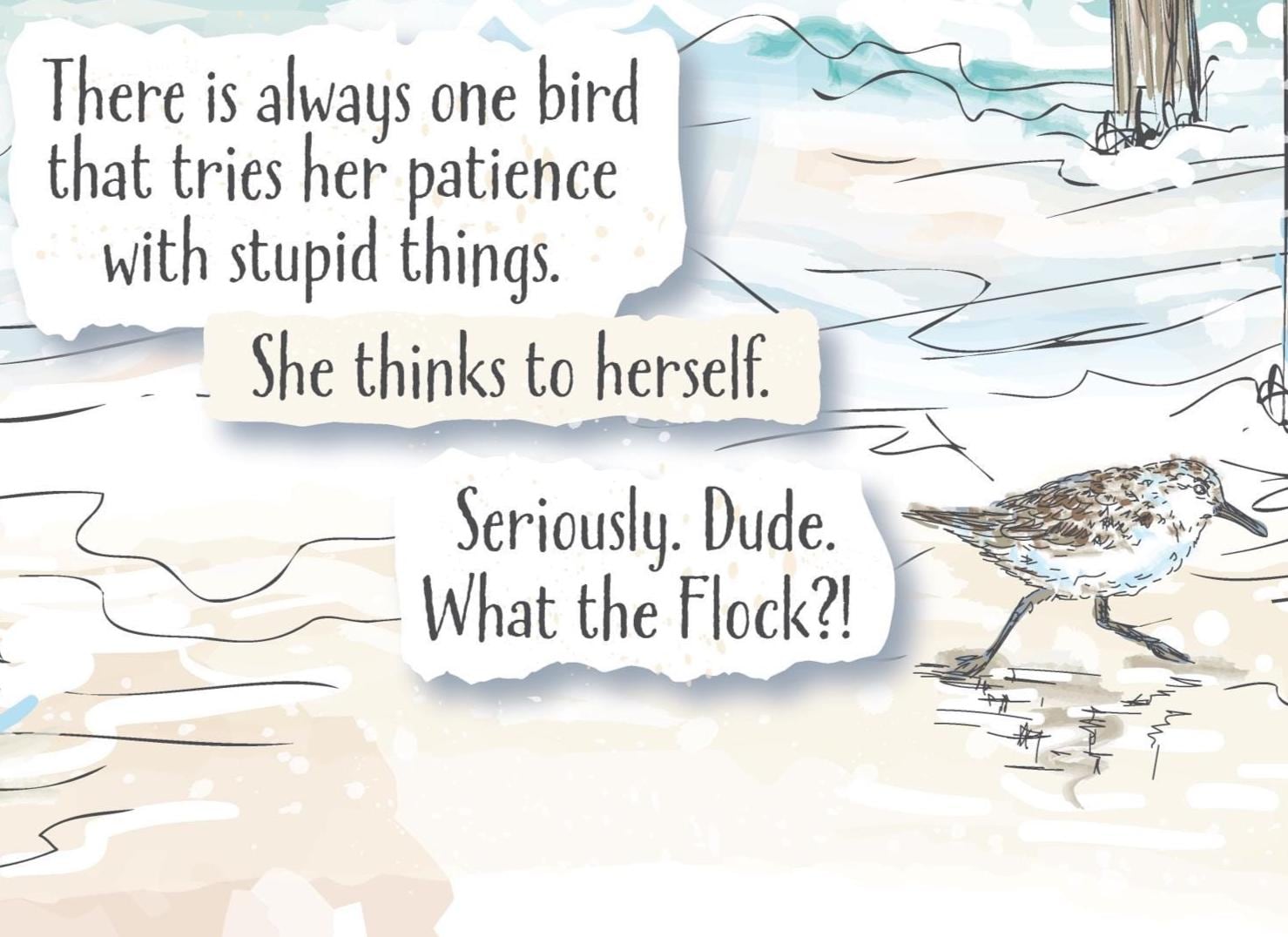 The story reads: “There is always one bird that tries her patience with stupid things. She thinks to herself… Seriously, dude. What the flock?!” It’s a gentle reminder that sometimes the best response to life’s small annoyances is to breathe, laugh, and keep walking.
