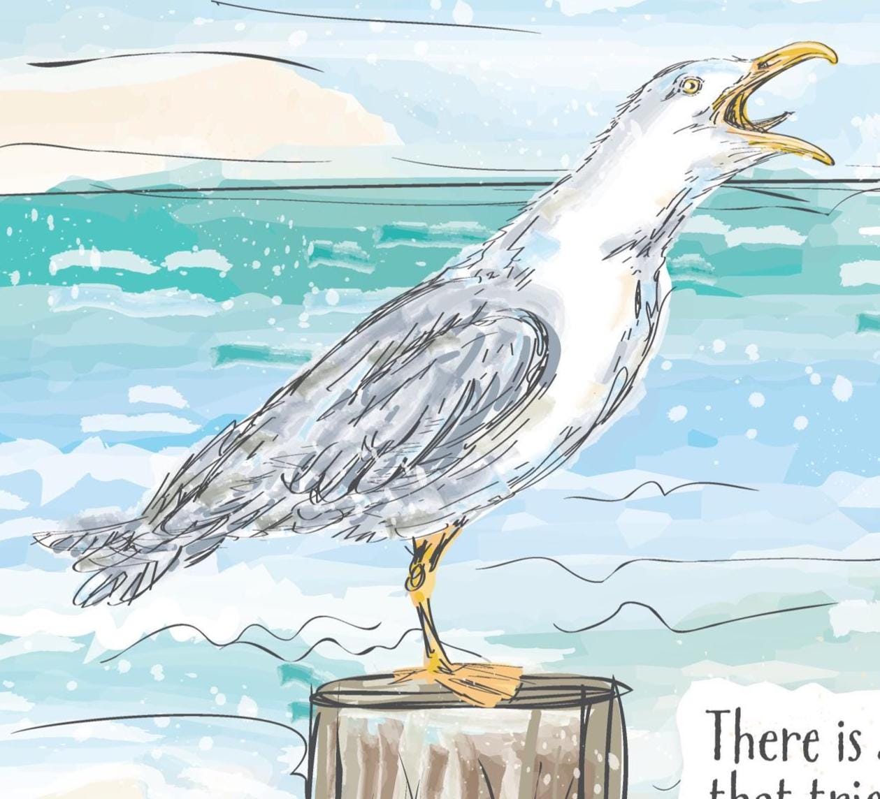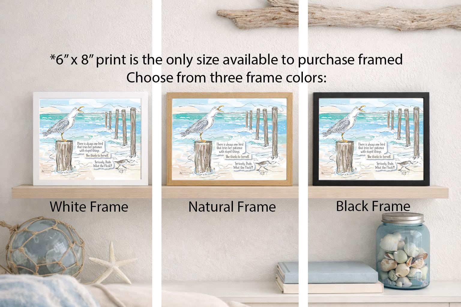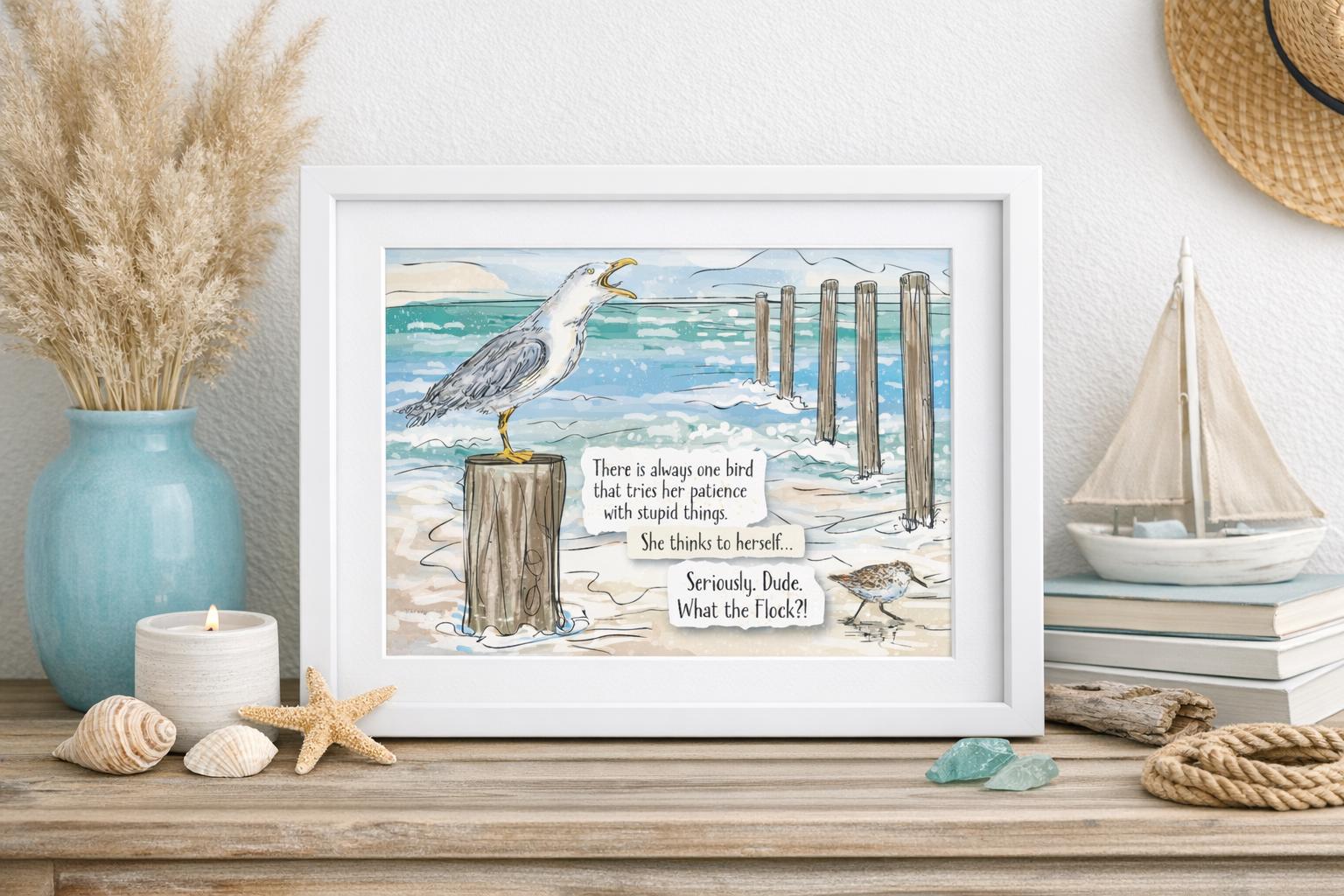 Perfect for beach lovers, bird watchers, coastal homes, or anyone who appreciates a little wit with their inspiration. Style it on a bookshelf, desk, or gallery wall, or gift it to someone who needs a reminder not to take life—or noisy seagulls—too seriously.