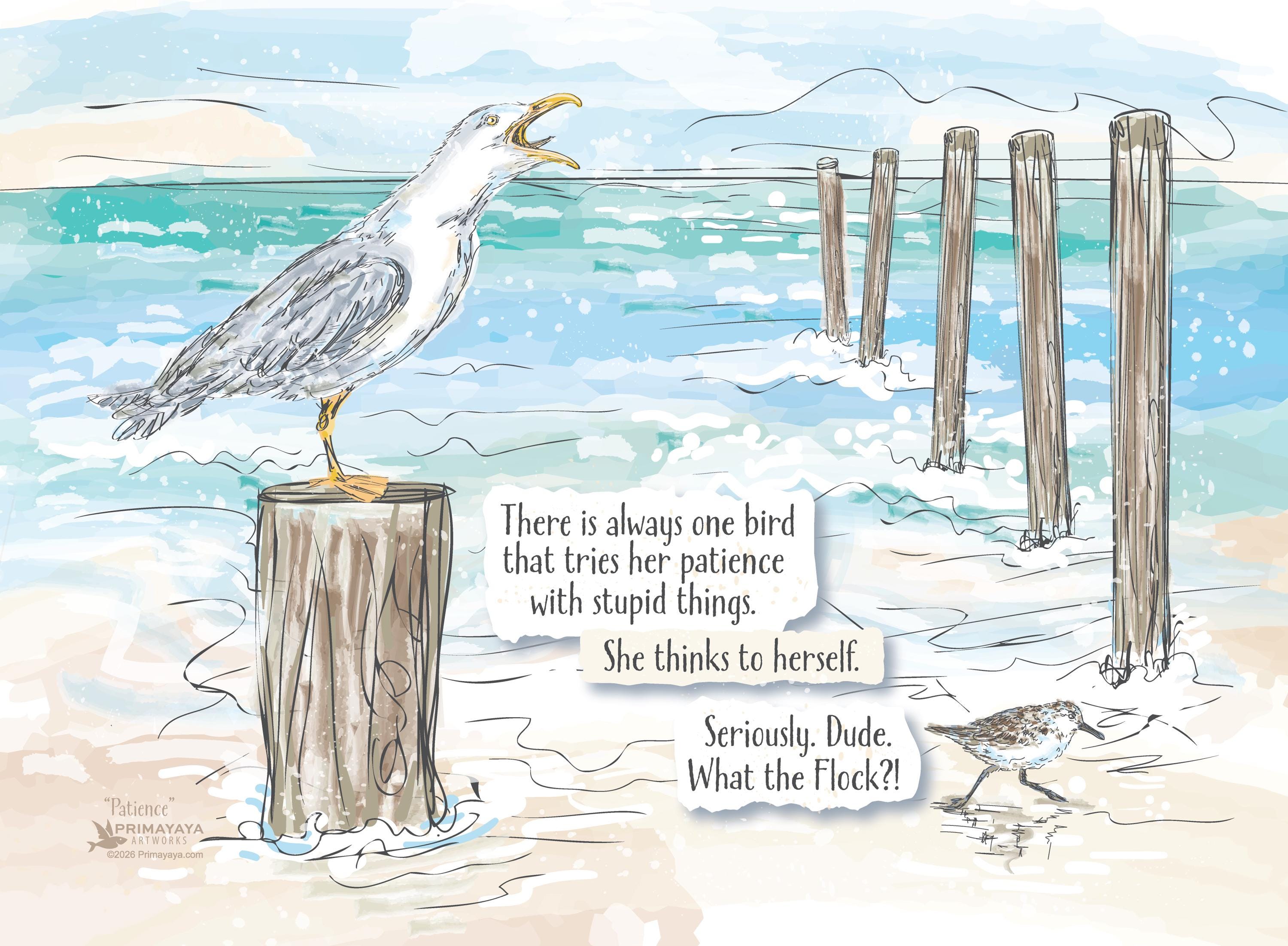 “Patience” is part of the Beach Stories art series. This funny and playful coastal print is a lighthearted take on dealing with that one loud, irritating member of the flock.