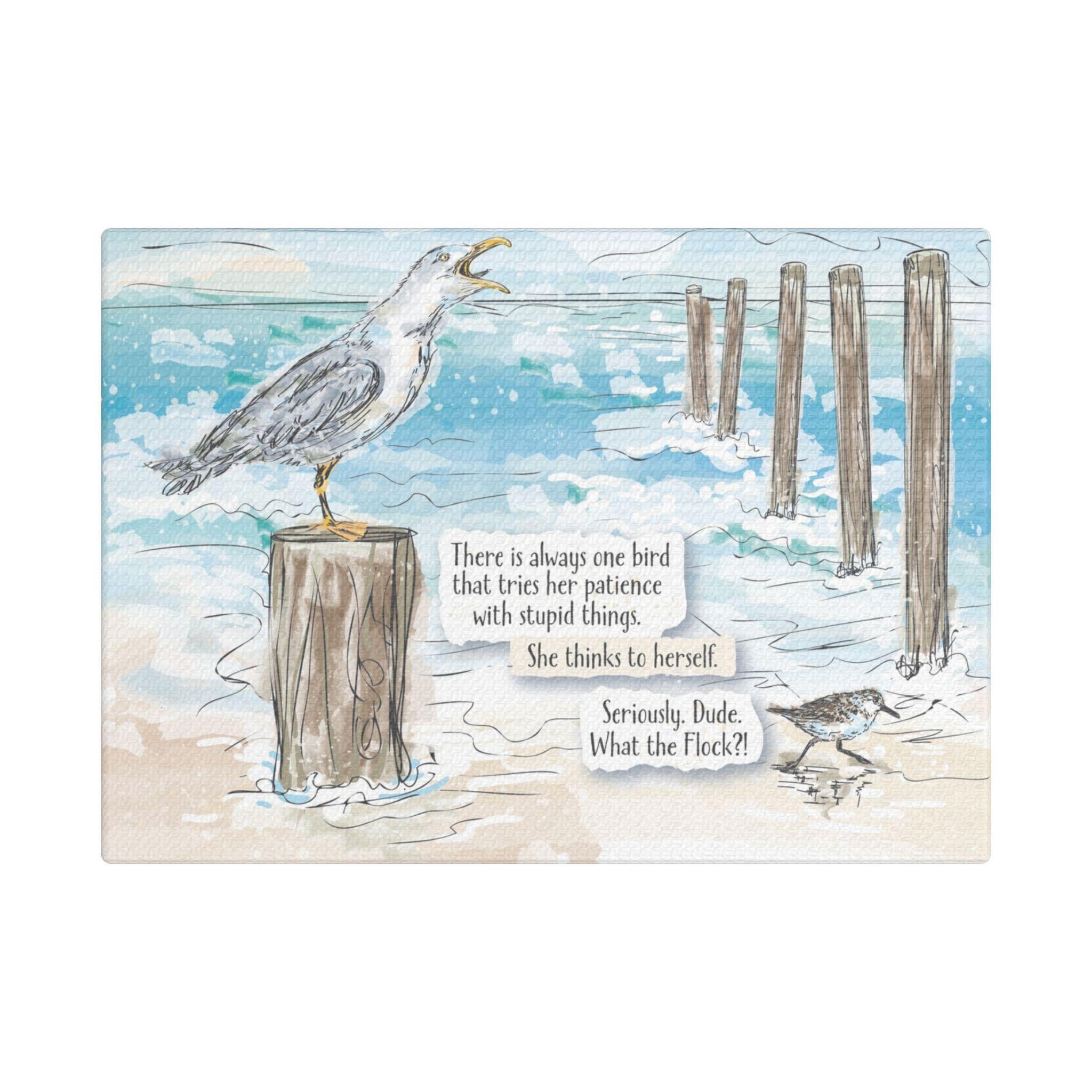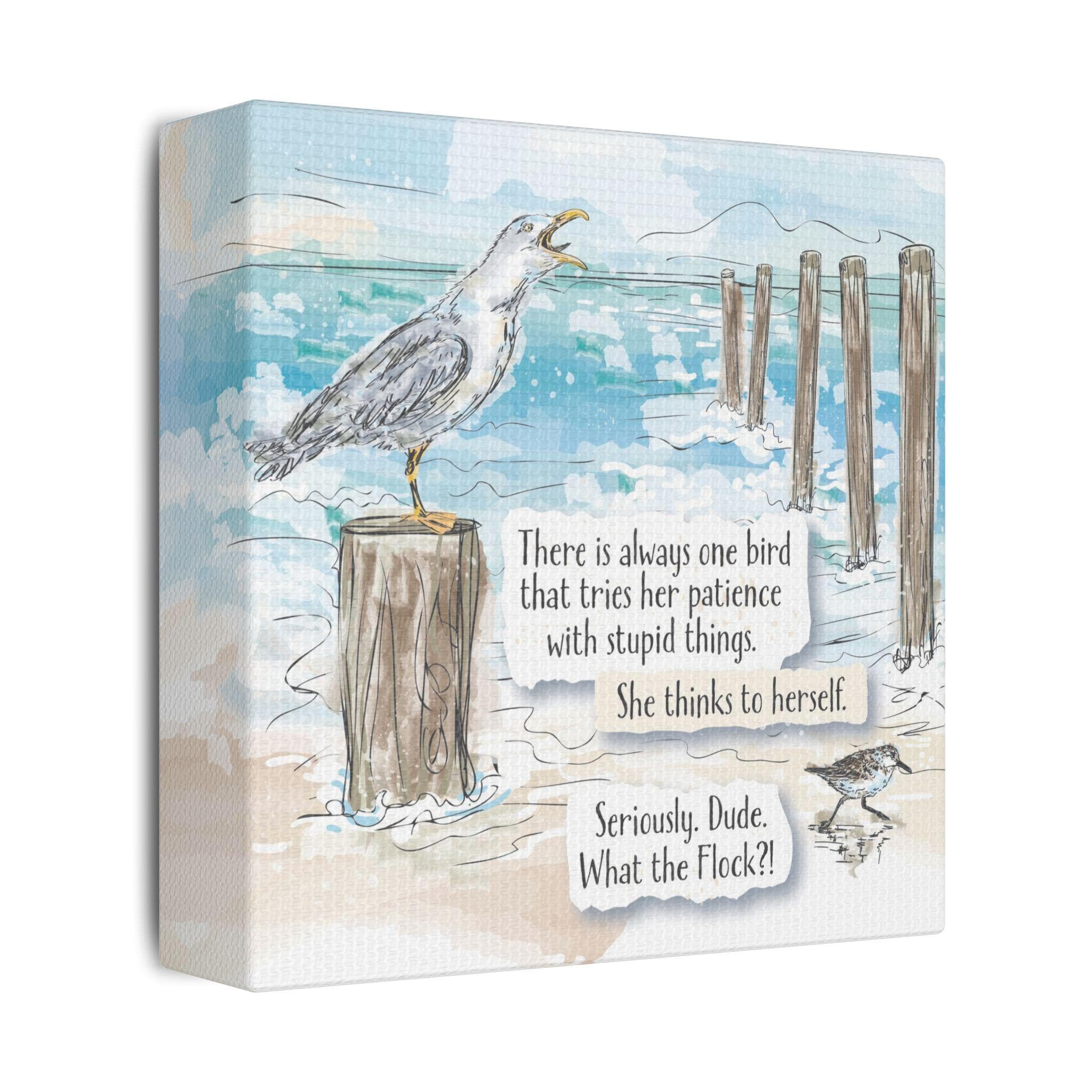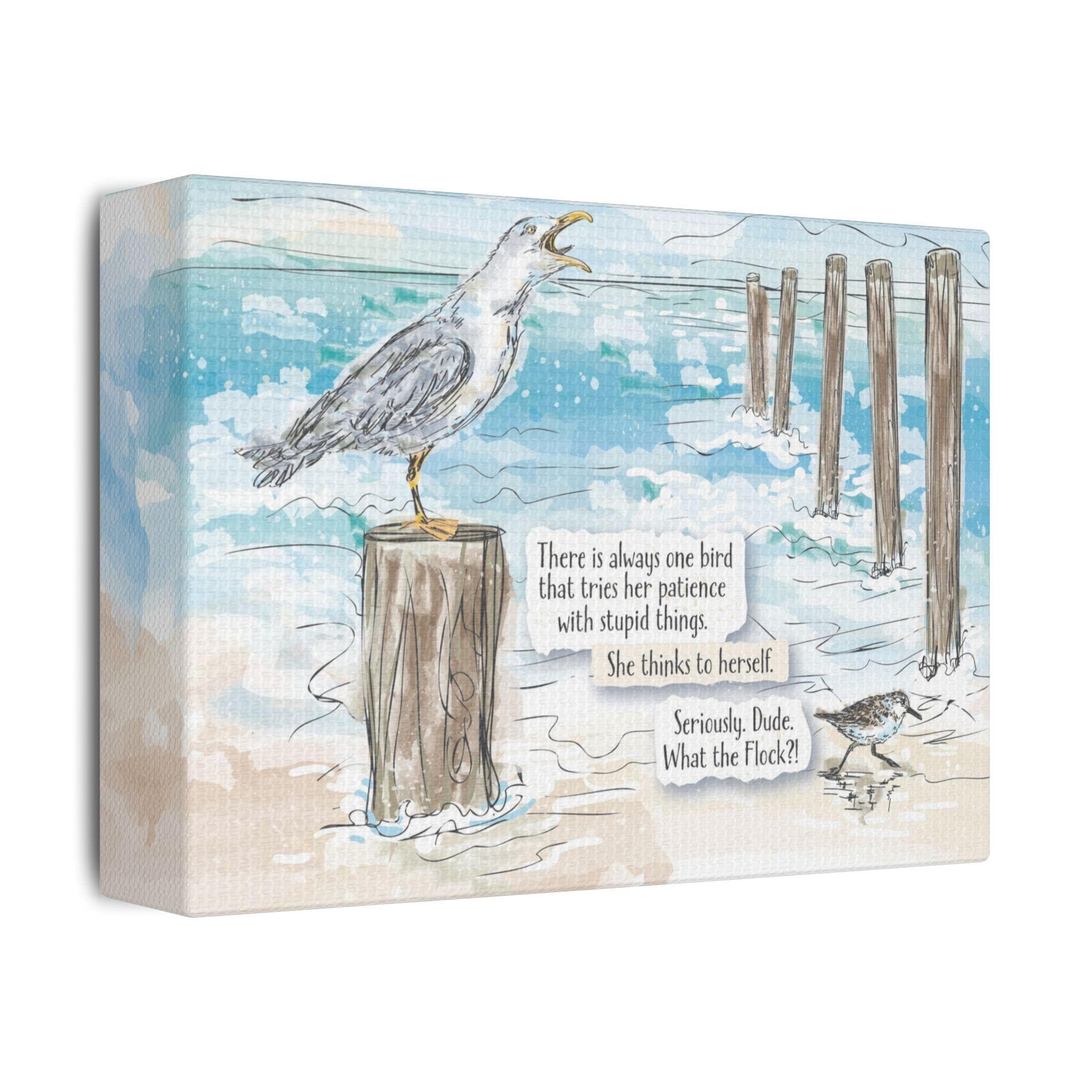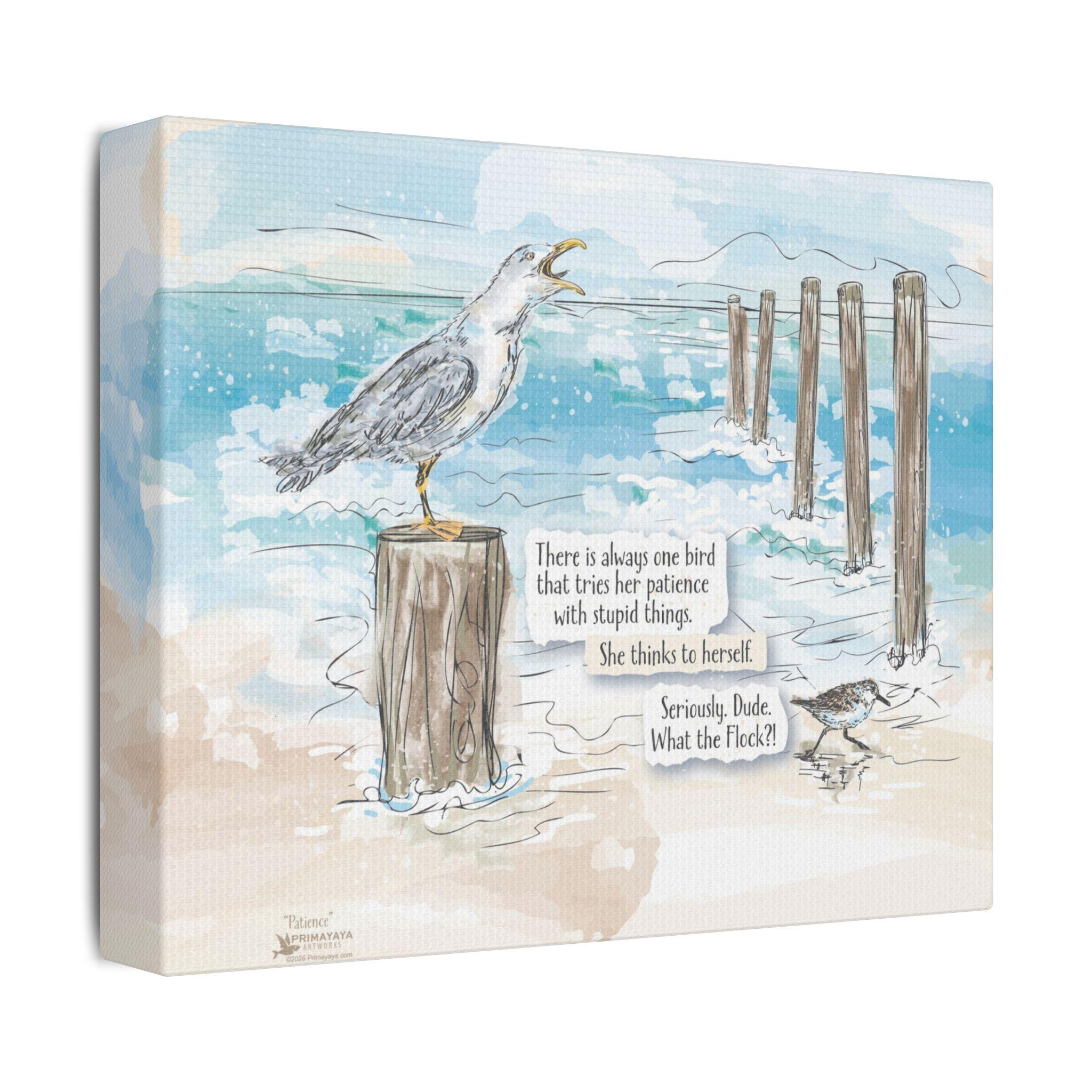 "Patience," is part of the Beach Stories art collection. This playful expression of dealing difficult individuals in the flock. Featuring a hand-drawn seagull discovering an unexpected treasure on the shore, this piece blends humor, and running away in a way that feels light, relatable, and encouraging.