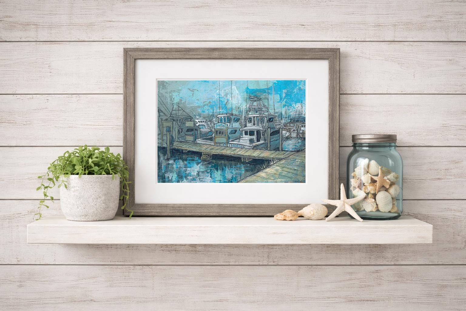 A quiet morning settles over Destin’s world-famous fishing fleet as the boats rest peacefully along the harbor. This professional art print captures that calm, in-between moment before the docks come alive—when the water is still, the air is soft, and the day hasn’t quite begun. The familiar charter boat Sunrise sits docked among the fleet, evoking the simple joy of an early walk along the marina and the timeless rhythm of coastal life.