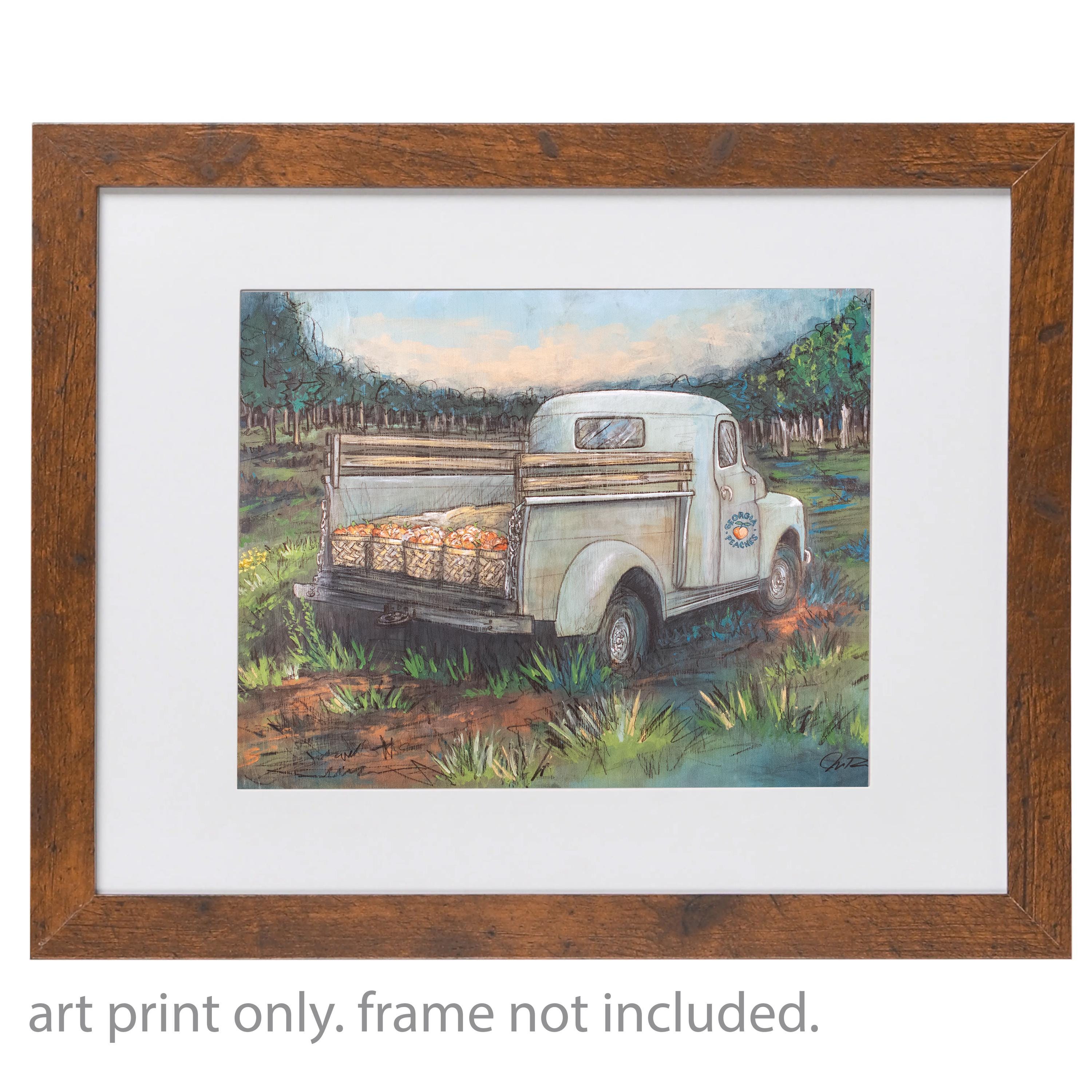 Georgia is the peach state! Inspired by Farmer's Markets and Road-side Stands. Includes a hint of of a red clay road under the truck sitting in a green field. Loaded with baskets of fresh peaches ready to sell.